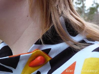 Kauluksen leikkelin aika lailla vapaalla kädellä siitä määrästä kangasta mitä oli jäljellä. Jouduin kääntämään kankaan eri suuntaan kuin muissa kohdissa. Kaulusta koristaa porkkanamainen nappi.