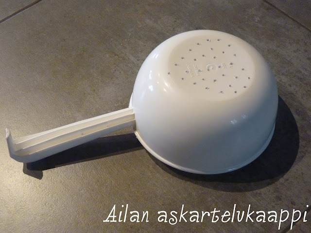 No mitenkäs sitten me isommat saunojat, jos pieni kippo ei riitä? Sitä varten askartelin vähän suuremman "sadesuihkun". Tämä suihku askarreltiin äitini pihasaunaan kesäksi, sopivasti äitienpäivälahjaksi. Se on läpäissyt meidän kotisaunan testit. Sen avulla voi vaikka pihasaunassa (jos ei ole suihkua) auttaa toista peseytymään, pitämällä kauhaa ylhäällä. Vesi valuu kauhasta pois tasaisesti. (Nyt varmaan orthex tai joku muu varastaa ideani?)