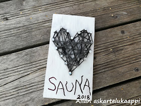 Sielläpä kyltti koristaa nyt saunan ovea. Olipa kiva projekti. Tällaisia pieniä sisustuskylttejä voisi hyvin tehdä vaikka pienenä tuliaisena joskus jollekin. Siispä käytän myös tunnistetta lahjaidea jälleen. Sieltä tunnisteista, kun on kätevä käydä välillä etsimässä ideoita.